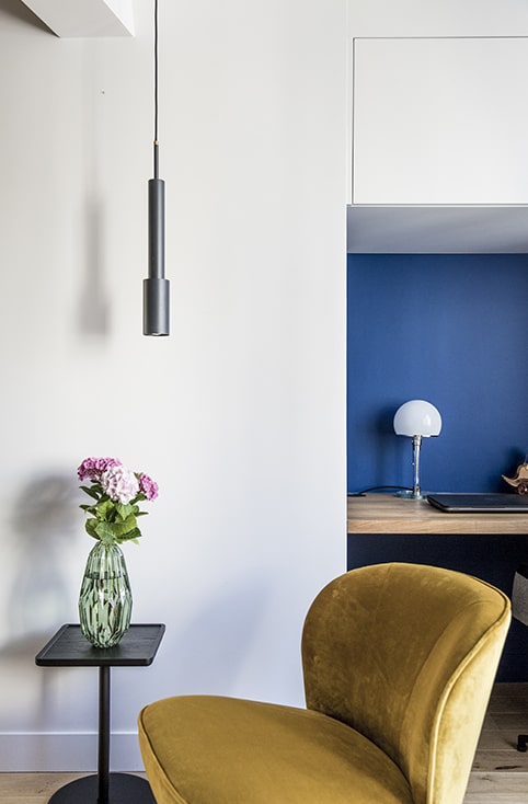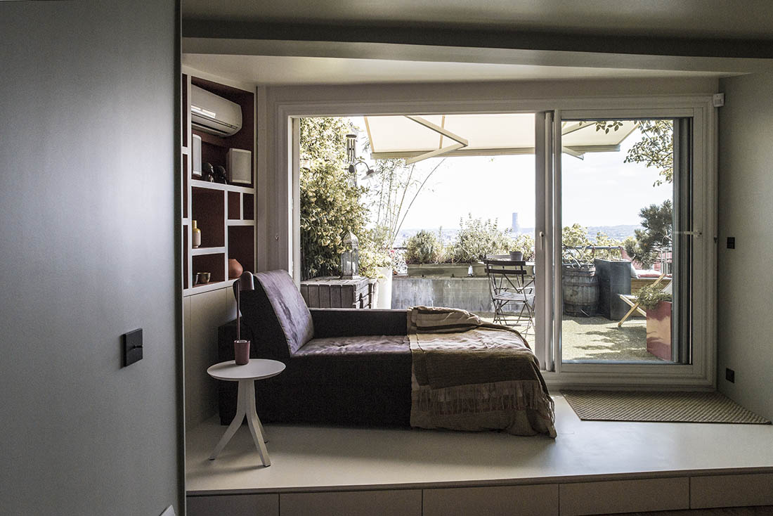 Côté salon une cheminée contemporaine a été ajoutée. Son socle se poursuit en banquette face au canapé. Au centre de la pièce, le meuble offre un ensemble de placards et d’étagères, et en partie basse une table qui se déploie sur la partie salle à manger. Sur la gauche du linéaire, l’estrade démarque l’espace bureau et amorce la montée d’escalier, créant une transition vers le second niveau. A l’étage, la chambre donne sur une terrasse surplombant la ville. Le long de la baie vitrée, une estrade dans le prolongement de la terrasse apporte un effet de continuité entre intérieur et extérieur.