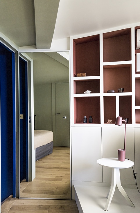 Côté lit, l’effet d’alcôve de la sous-pente est prononcé par le choix d’une teinte douce appliquée aux murs et au plafond, délimitant l’espace.