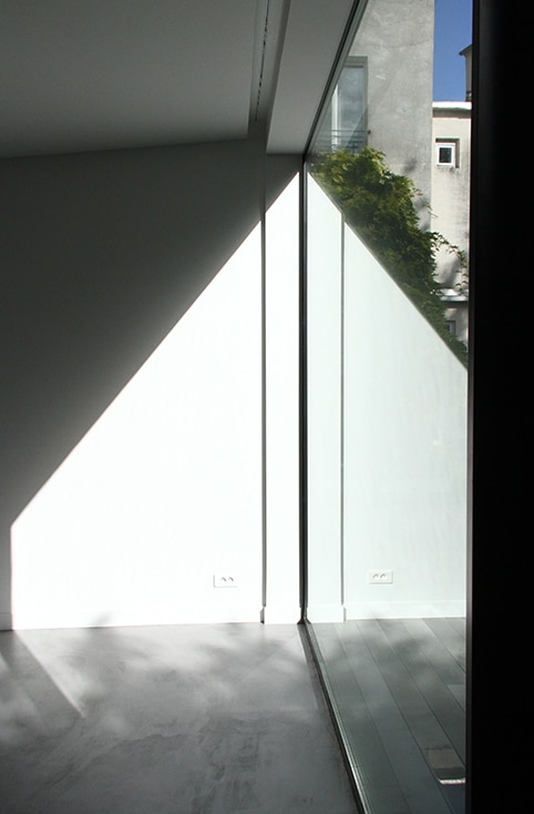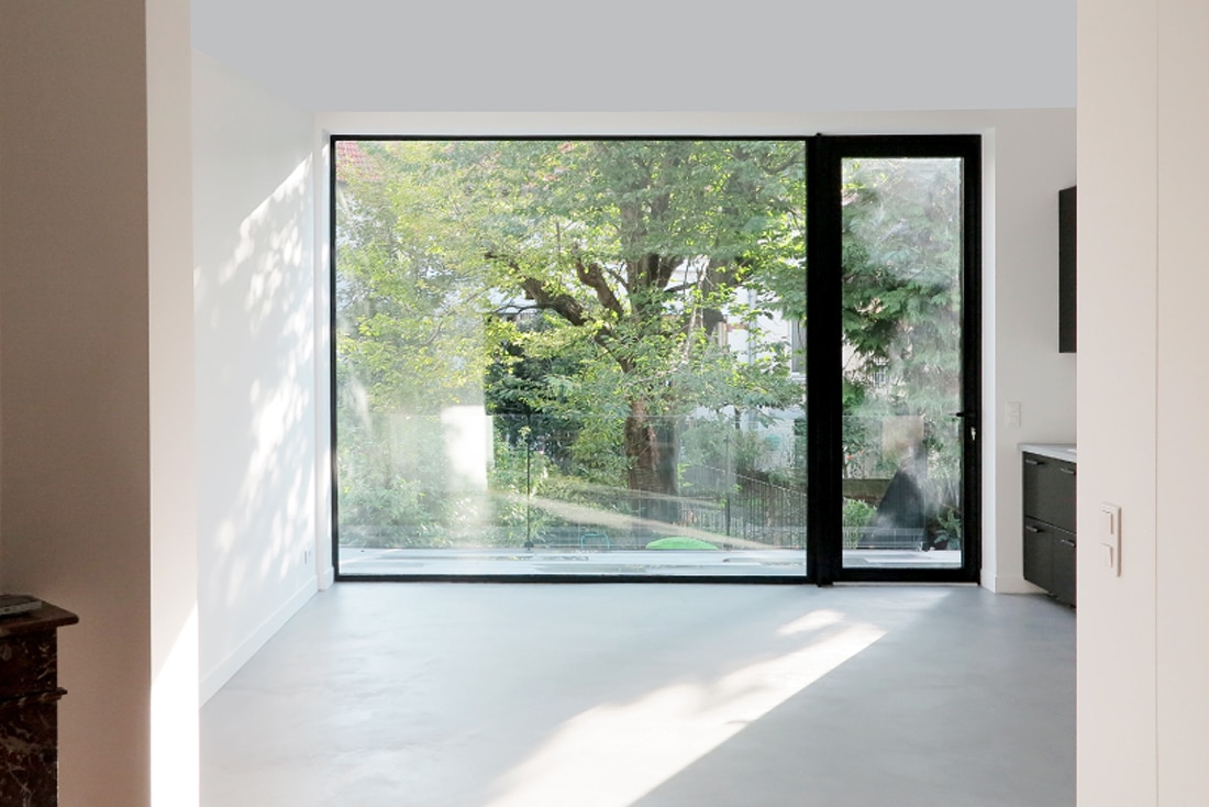 Contraint en hauteur par les fenêtres de l’étage contre la maison existante, le volume de l’extension s’élève côté jardin, grâce à sa pente de toit inversée. La façade, en briques sombres côté jardinet, est quasi entièrement vitrée par une large baie surdimensionnée. Sur la droite, une porte donne accès à un balcon menant au jardin.