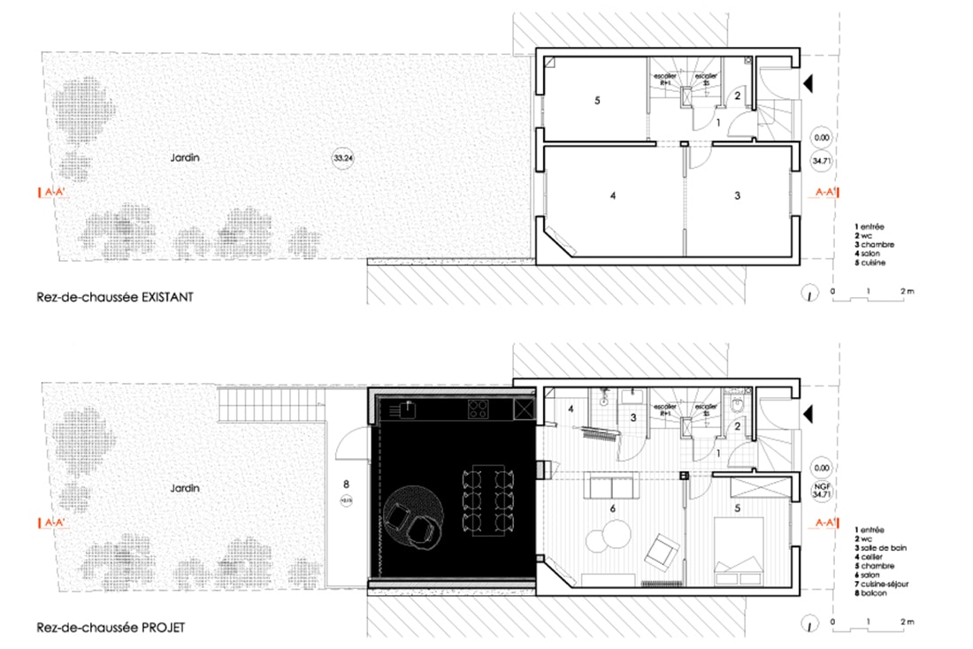 Le rez-de-chaussée, en surplomb de quelques marches depuis la rue, se retrouve au premier étage côté jardin, accessible uniquement depuis le sous-sol.
