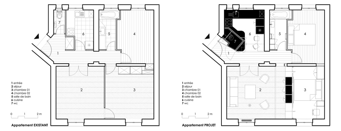 Les cloisons séparant l’entrée des WC et de la cuisine sont abattues, ainsi que la cloison entre le salon et la première chambre ; le projet privilégie un mobilier sur mesure pour le partage des pièces.