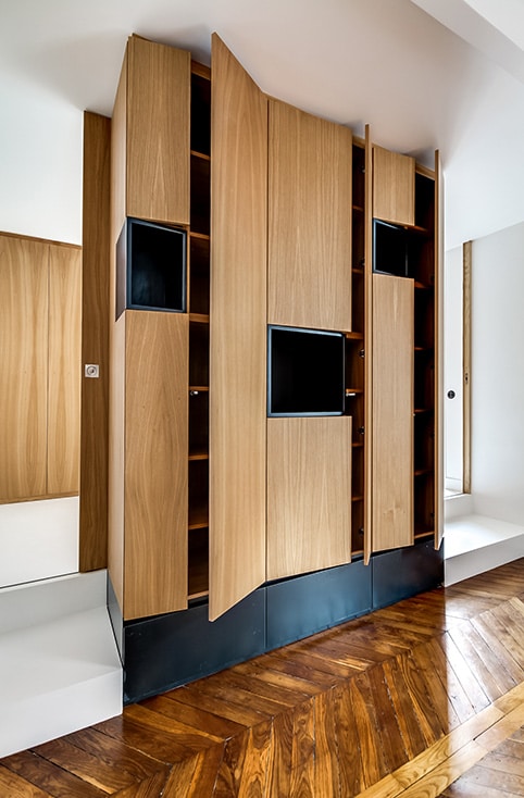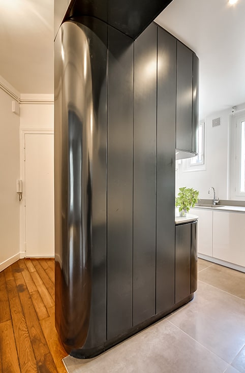 Face au salon, un meuble sculptural noir laqué, arrondi, vient redistribuer les espaces depuis l’entrée : il intègre les sanitaires dissimulés par une porte sous tenture, et se poursuit dans la cuisine, offrant de nombreux placards de rangements sur toute sa hauteur. Les espaces de distribution réduits dans l’entrée permettent de développer un linéaire de cuisine plus important. L’ouverture entre le couloir et le salon face à la cuisine est élargie, favorisant la perméabilité entre les pièces à vivre.