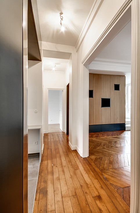 Pour cet appartement de 3 pièces familial situé avenue Niel, les maitres d’ouvrages avaient pour souhait d’augmenter les surfaces des espaces à vivre, en réduisant les chambres.