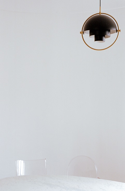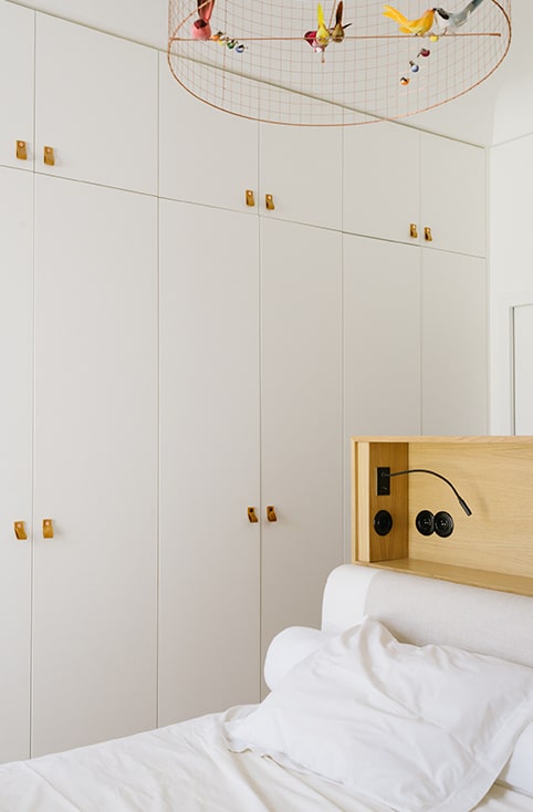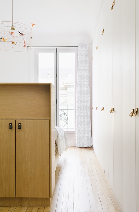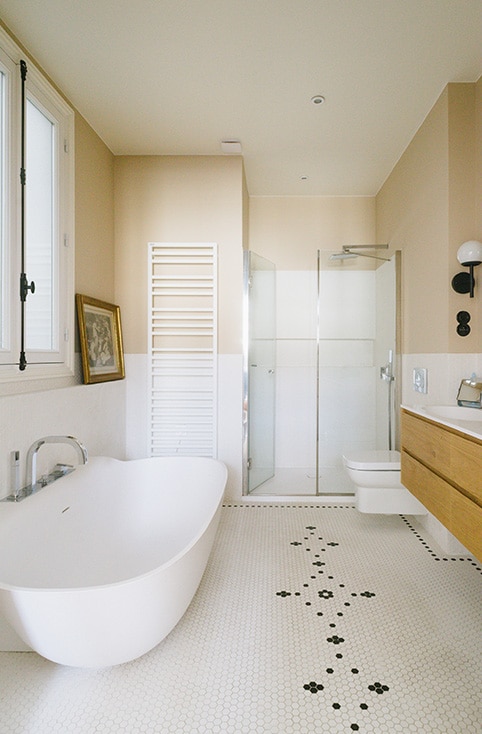 La cuisine, initialement distribuée par le long couloir dans la seconde partie du logement, est rapidement projetée au cœur de l’appartement, face aux salons. L’ouverture sur la galerie d’entrée est agrandie pour accueillir une cloison vitrée, apportant une plus grande perméabilité entre les pièces à vivre. Dans une recherche d’adéquation de style avec l’immeuble et les formes de l’appartement (courbes, ornementations, gardes corps etc.) cette grande verrière laquée noir mat est dessinée en arcs de cercle, laissant apparaitre une cuisine sombre en bois avec plans de travail en marbre, conçue dans un style sobre et contemporain. Le sol de la salle de bain des parents est réalisé en émaux hexagonaux blancs et noirs dessinant un motif, dans l’esprit de l’immeuble.